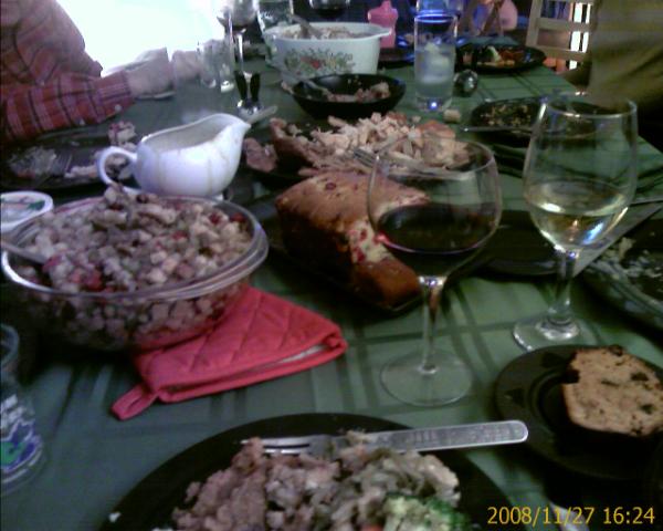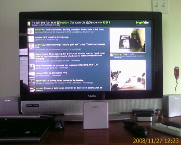 The Brightkite Wall essentially turns your display into a simple electronic billboard, showing a stream of posts (text and images) as they come through the service. Last year I fed this directly to my television and let my family watch people comment and post photos throughout the day, watching shot after shot of peoples’ meals, kitchens, families, turkey failures, plate mishaps, and comments about naps. It seemed a little voyeuristic, but it was also a great way to experience Thanksgiving across the country as a whole, feeling some sort of connection with people I’ve never met. We watched meals ebb and flow with the timezones, people try to juggle more than one stop, and many missives about things for which people were thankful (and more than a few for what they were not thankful). It became quite an interactive affair in my house as everyone commented on their favorite images or updates and as they pressed me to post photos of our meal.