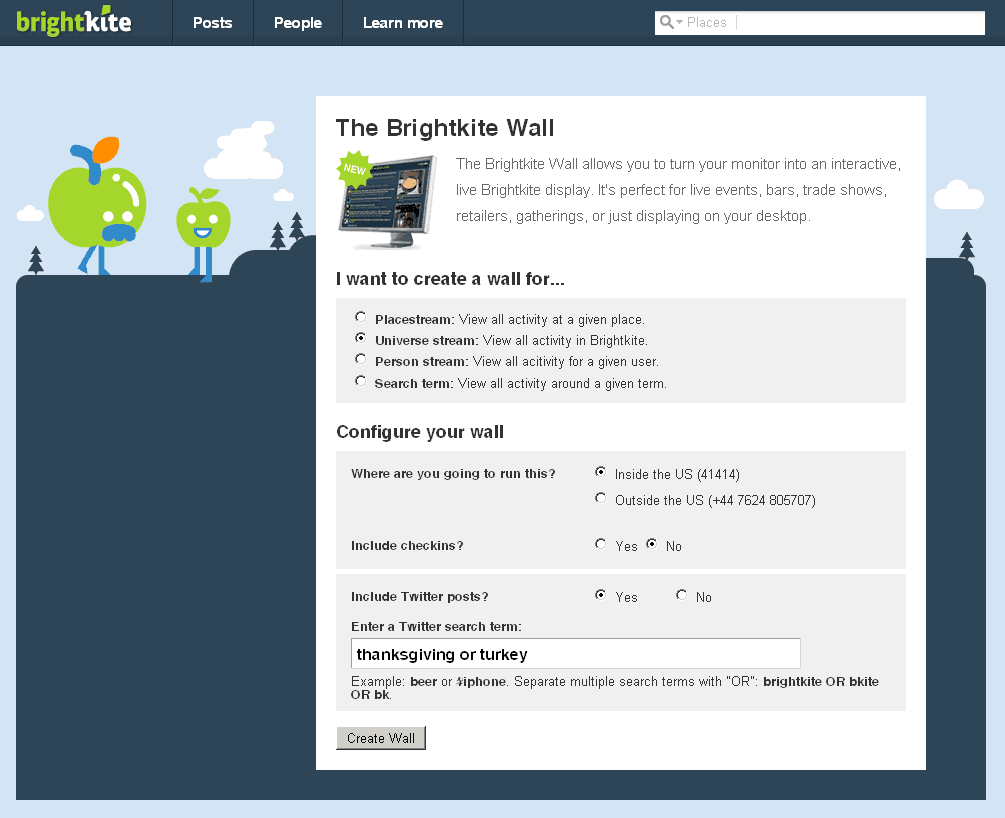Last year I hosted Thanksgiving dinner at my pocket-sized house and practically counter-free kitchen for a dozen people. Since I had been in the kitchen almost non-stop since the prior afternoon I wasn’t in much of a position to entertain my guests, but I did have something they found fascinating. I had just discovered the Brightkite Wall.