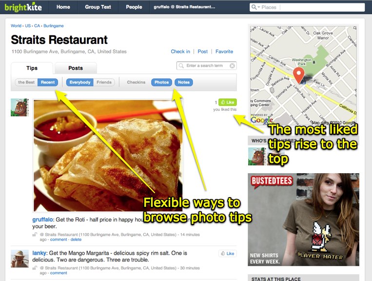 Brightkite is working to be more relevant to the average web surfer using its image-happy almost-food-centric users by allowing them to post tips to venues (Tippety Top. Brighkite launches photo-tips). Oddly, as a Brightkite user, I first heard about this from Mashable (Brightkite Launches Location-Based Photo Tips), and then pestered Brighkite about this until it posted the announcement to the official blog hours later (I’m not implying that I caused Brightkite to post it, I am not that awesome).