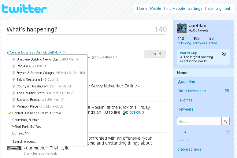 Earlier this week Twitter announced Twitter Places, allowing users to associate tweets with specific places, not just latitude/longitude or data pushed in from other services (Twitter Places: More Context For Your Tweets). Up until this announcement, you could associate a tweet with a specific place by pushing a location with the tweet, as Brighkite does when it pushes an update to Twitter. Twitter even made best-guesses from your latitude/longitude to regions on a map (such as “central business district” or general community names). Now the Twitter web site and mobile site will support this feature so you don’t need to rely on an additional application. The mobile applications, however, do not yet support it.