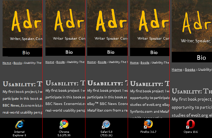 I noticed the browsers were generally consistent on the font scaling and weight, with minor differences in anti-aliasing and line-height. Shadows showed greater variance among the browsers. Opera seemed to have a whole different idea of font weight, size, and anti-aliasing, but wasn’t so far out of the park that it was unusable. Most interesting was how punctuation was treated. Note how only Internet Explorer and Opera show the commas in the tag-line under my name, or after the word “project” in the first sentence. Chrome, Safari, and Firefox each lost the commas altogether. While I am comfortable with the other display differences, losing punctuation is a deal killer for me.