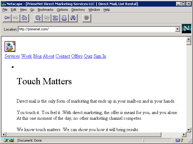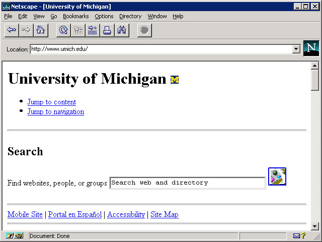 What I have done is gone back and looked at the most visited domains in 1996 — the year that Netscape 2 was making it big (2.0 came out in September of 1995, but factor time for adoption and sites to adapt, and 1996 represents more of the Netscape 2 world). I fired up my copy of Netscape 2.02 (which you can get from the evolt.org browser archive), set it to 640 x 480, and went about visiting the modern versions of the top 10 sites of 1996. You may note that some have gone away. Clicking the image will bring you to a larger size.