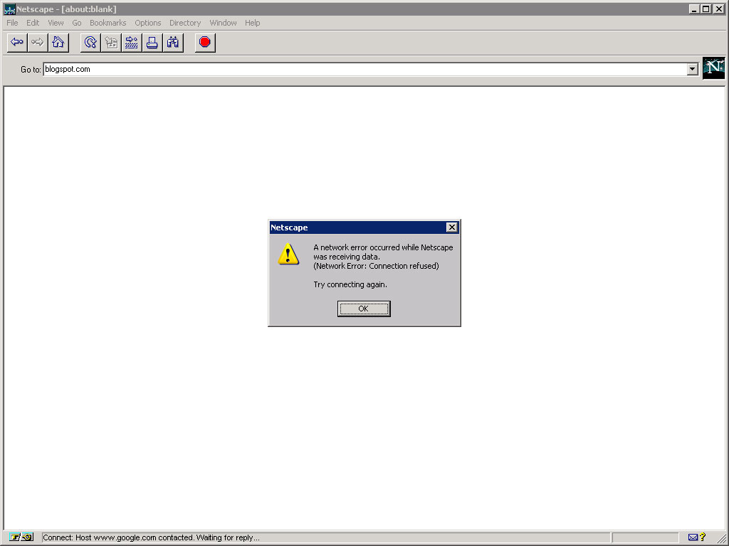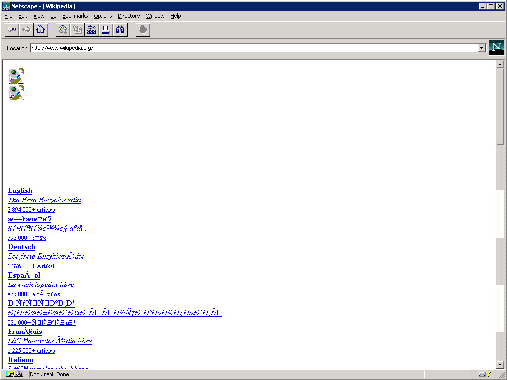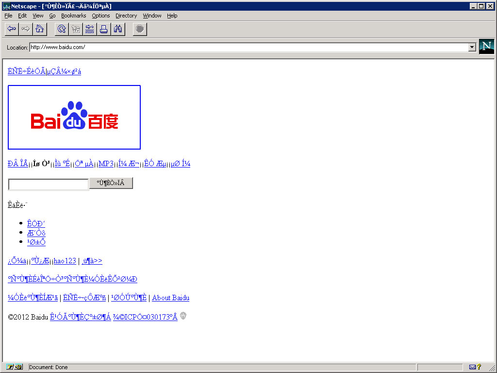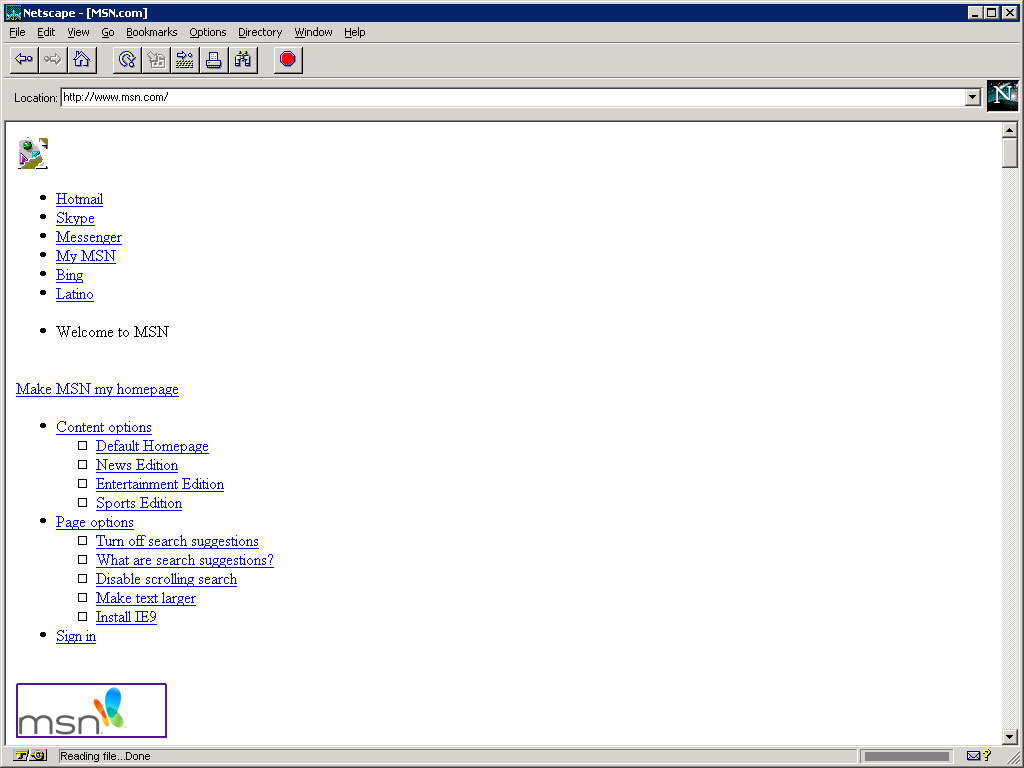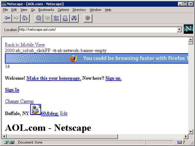 If somehow you were resigned to using Navigator 2 for your surfing needs today, how much could you get done? Many sites try to serve XHTML and won’t even render, other sites rely on JavaScript and won’t render. Most sites use CSS so you won’t see much layout. And if a site uses PNG images then you won’t see many inline pictures, either. I did, however, assume a new monitor for our 1996-era user and scaled the window up to 1,024 x 768. Mostly so you could see a little more of the page. I surfed to the top 10 sites from July 2011 as determined by ads served (so my blog won’t be in there).