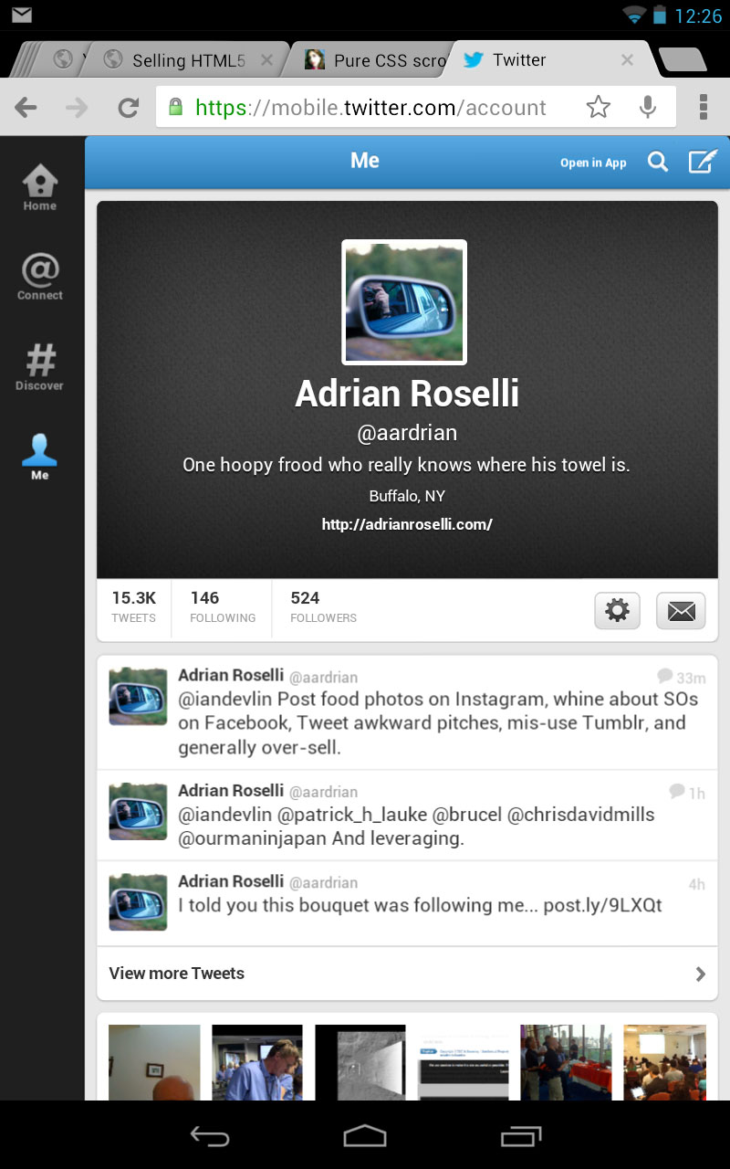 The mobile browser experience isn’t much better. The text is nearly illegible, but at least the hyperlink to my site appears to be bold, if smaller. Only three tweets are visible and then there is a bar with images I have posted. The worst part is that only one of those is mine (the other five are retweets), they are from July, and the thumbnail, when tapped, loads the wrong image. I don’t like my tweets being truncated for this low-value content.