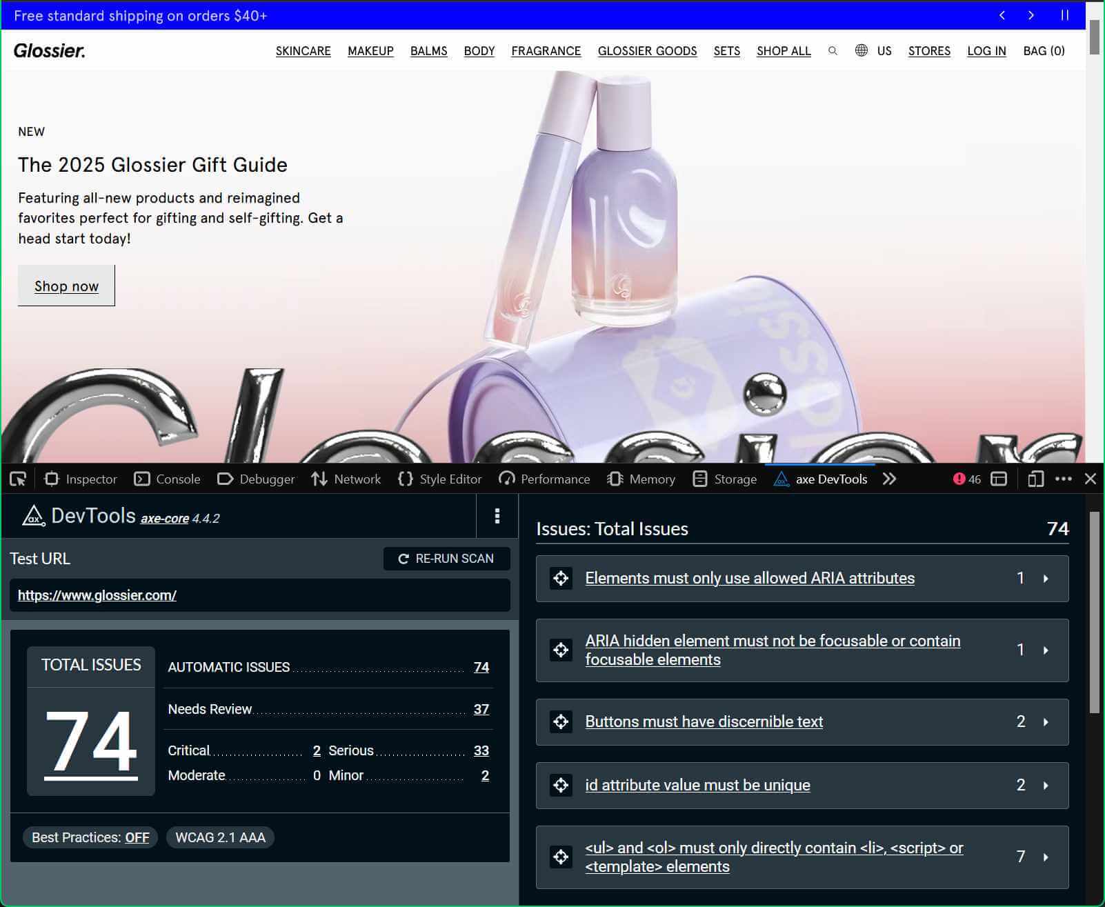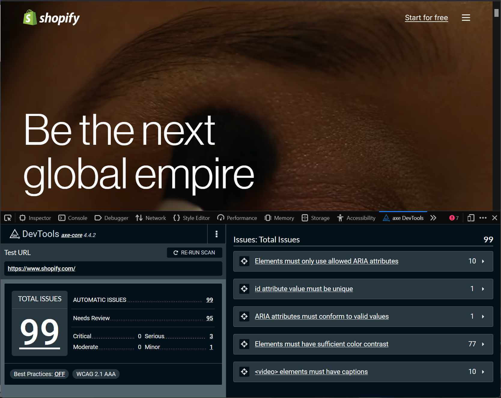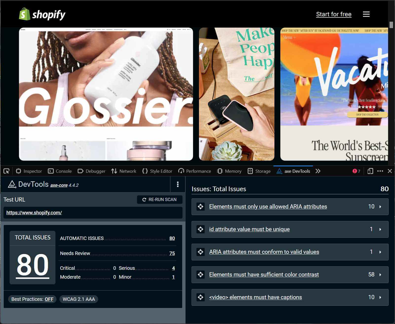 But with nearly a hundred possible WCAG violations on its home page, Shopify’s offering is clearly not up to task. These violations are identified by automated tool that, according to my own testing, reports only around 15% of actual WCAG violations. For example, the autoplaying video on the home page fails Success Criteria 1.2.1: Audio-only and Video-only (Prerecorded) and 2.2.2: Pause, Stop, Hide, neither of which was caught by the automated test.